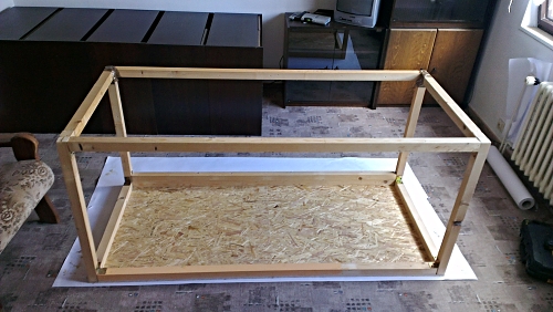 1. krok - podlaha - položíme na zem desku podlahy z 12mm OSB ( ze 2 dílů á 90 x 80 cm )