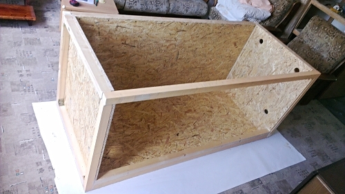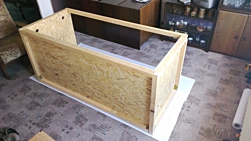 3. krok - vnitřní stěny - zevnitř trámkové kostry obložíme 3 stěny z 15mm OSB desky ( zadní